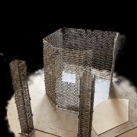 Im Inneren wird alle 5 Außenwände durch große Lochplatten ersetzt. Die Löcher haben die Proportionen der Ziegelsteine. Jedem Ziegel der Installation wird ein Name zugeordnet. Dadurch wird aber auch die äußere Backsteinfassade des Häuschens zu einer imaginären großflächigen Namenswand. Mein Entwurf definiert das Tor selbst zum Erinnerungsmal und will es als solches kennzeichnen.