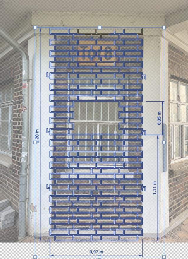 Im Inneren wird alle 5 Außenwände durch große Lochplatten ersetzt. Die Löcher haben die Proportionen der Ziegelsteine. Jedem Ziegel der Installation wird ein Name zugeordnet. Dadurch wird aber auch die äußere Backsteinfassade des Häuschens zu einer imaginären großflächigen Namenswand. Mein Entwurf definiert das Tor selbst zum Erinnerungsmal und will es als solches kennzeichnen.